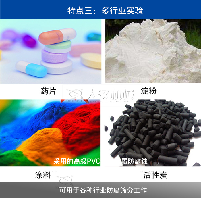 大漢機械生產的尼龍塑料振動篩廣泛應用于食品、醫(yī)藥、化工、磨料、礦山、冶金、地質、陶瓷、國防等行業(yè)的篩分、除雜、過濾、分級等精準篩分,在篩分的同時做到防腐蝕功能。